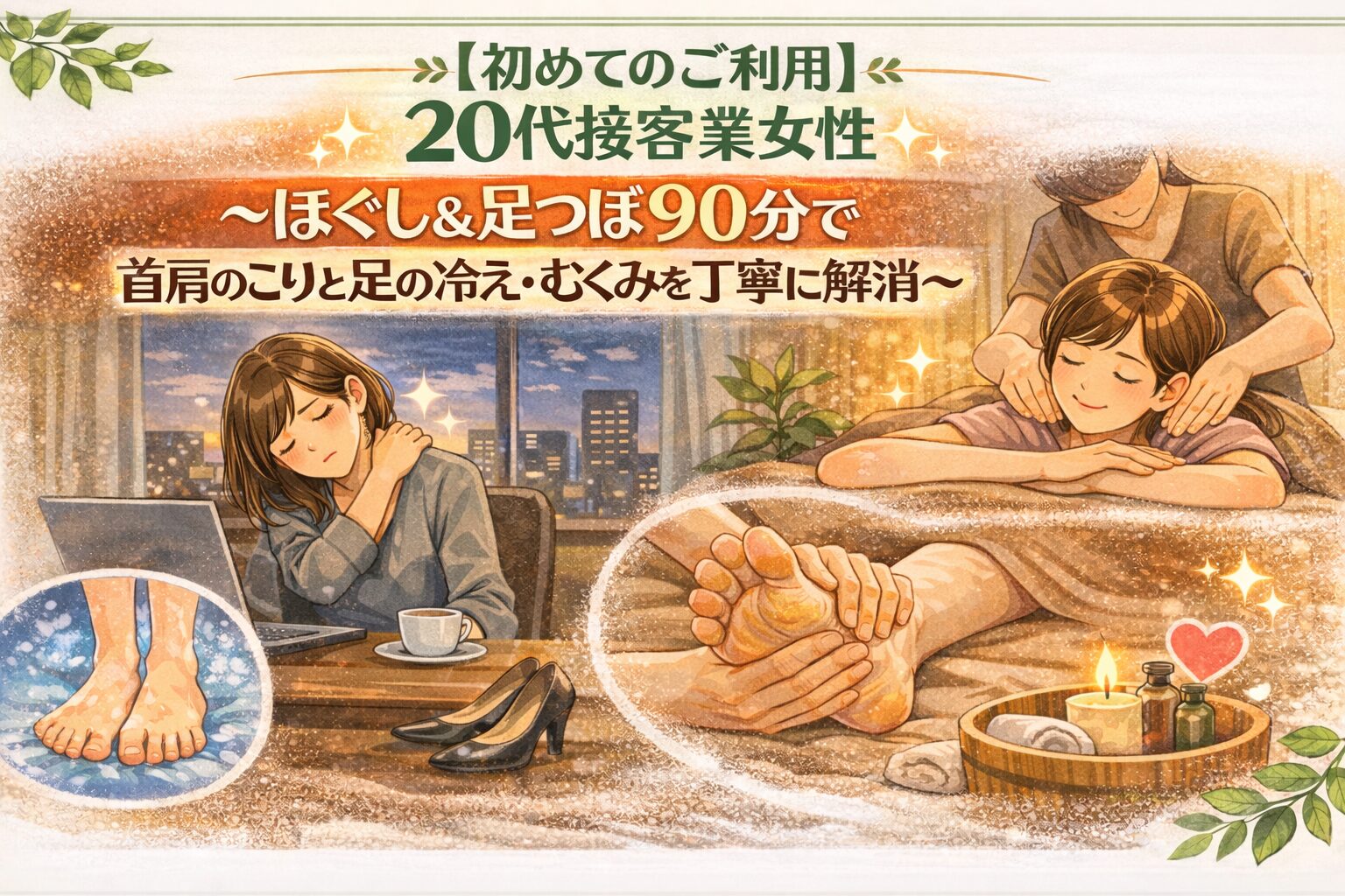 今回のお客様は、デスクワークと接客業による姿勢の負担から、首肩の緊張と足の冷え・むくみが強く出ていました。