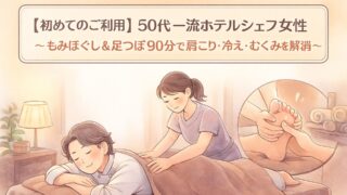 施術実績 【初めてのご利用】50代一流ホテルシェフ女性〜 もみほぐし&足つぼ90分で肩こり・冷え・むくみを徹底ケア 〜 11月に入り、朝晩は冷え込みが強まり、身体がこわばりやすい季節になりました。寒暖差によって血流が滞り、肩や背中の筋肉が硬くなる時期でもあります。そんな中で、日々ハードなお仕事をこなす方ほど、定期的なメンテナンスが大切です。 施術実績